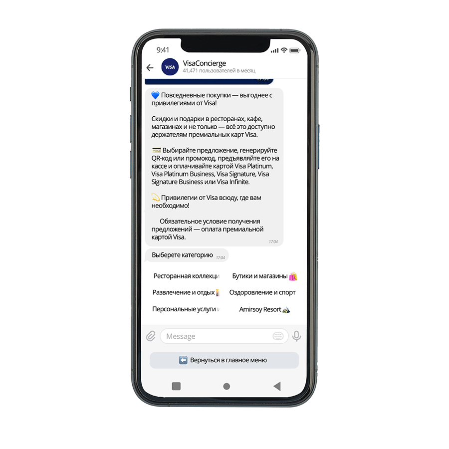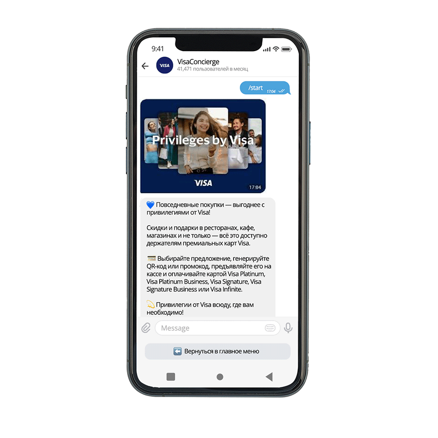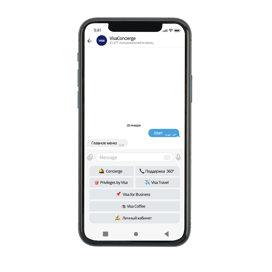 - Авторизуйтесь в чат-боте VisaConcierge;